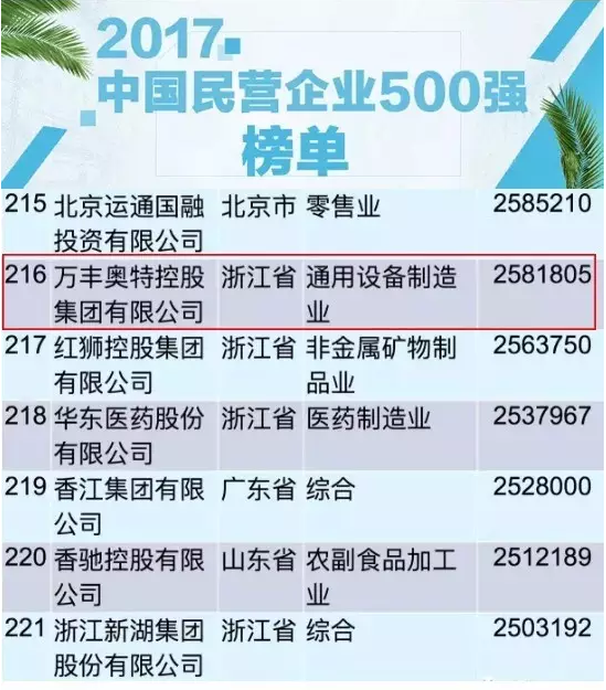 萬豐奧特再次榮列2017中國民營企業(yè)500強(qiáng)